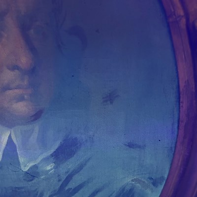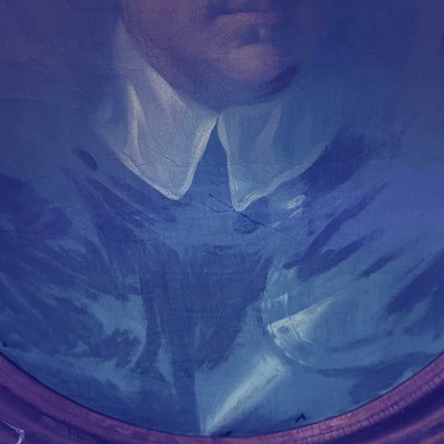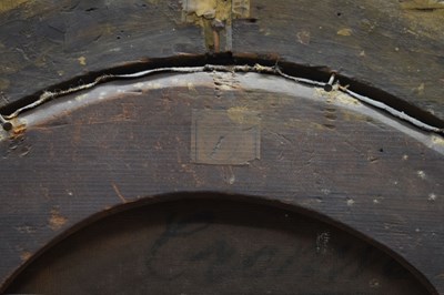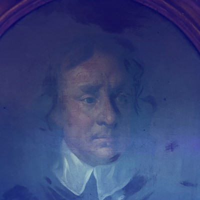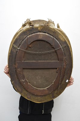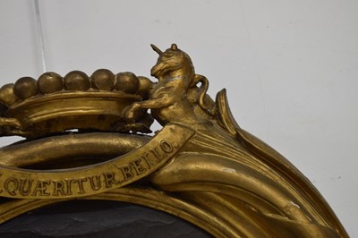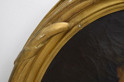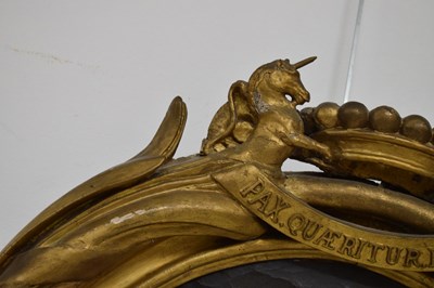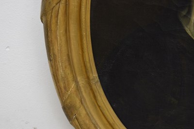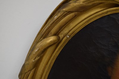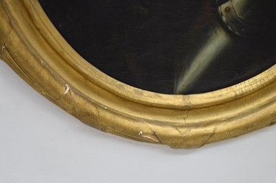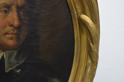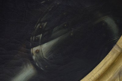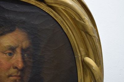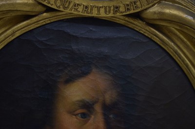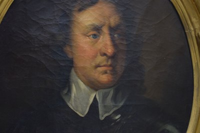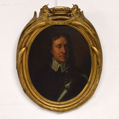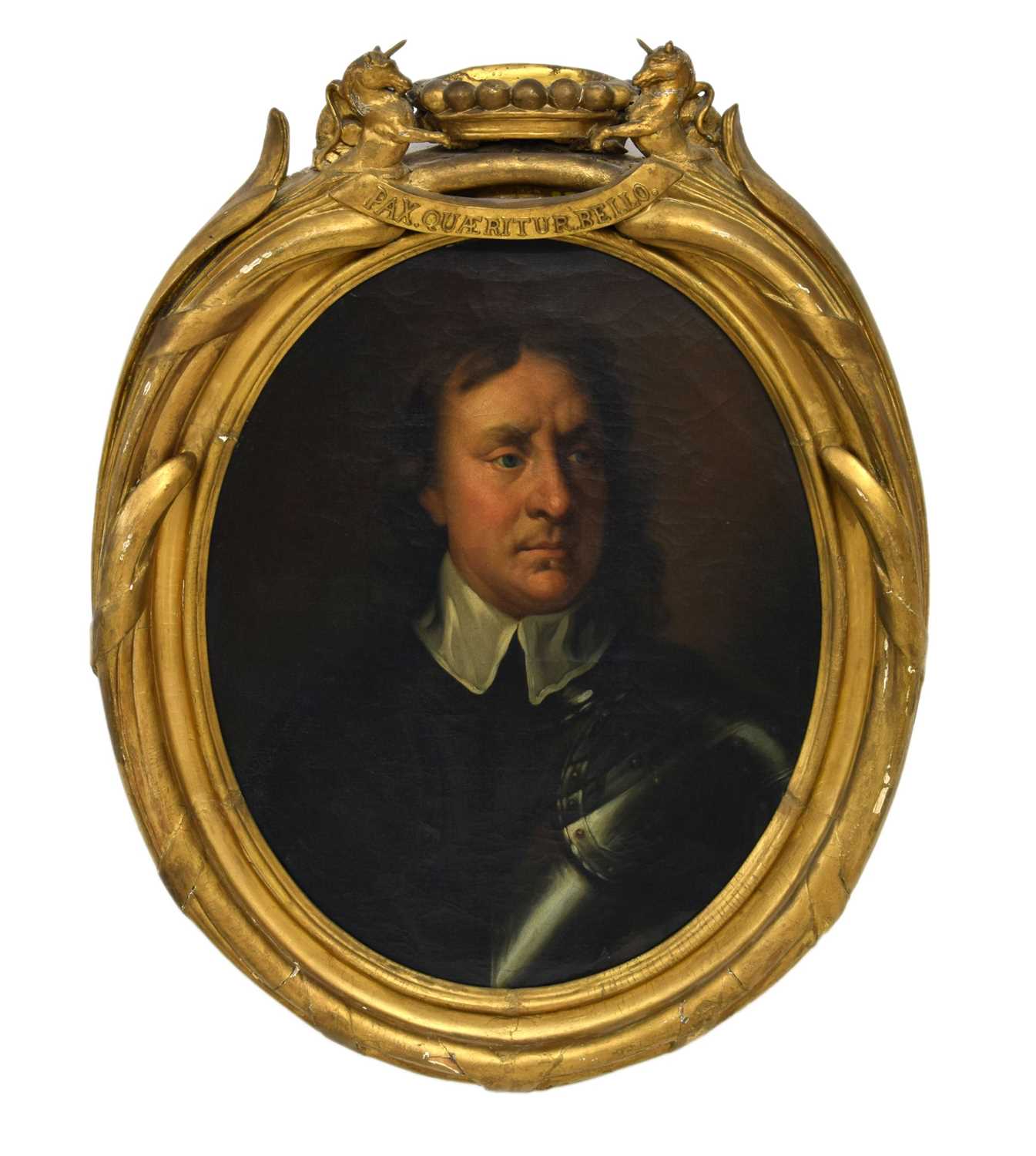 After Sir Peter Lely, (1618-1680) - Oil on canvas - Early 18th century Italian (Florentine) School portrait of Oliver Cromwell, after Lely's c. 1650 original in the Galleria Palatina (Palazzo Pitti), Florence, inscribed to canvas verso 'Cromwell / Antonio Tasso / Borgo Ognissanti N. 40 [?], Firenze', oval, 63.5cm x 50.5cm, in a fine period gilt oval foliate moulded frame, surmounted by opposed unicorns flanking a seven-ball coronet over banner motto of Cromwell's Commonwealth 'Pax Quæritur Bello' [Peace is obtained through war], 89cm high overall