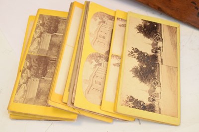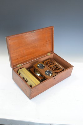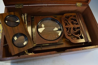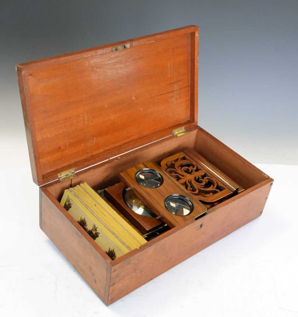 Victorian walnut stereoscopic viewer with fret work stand, and a quantity of stereoscopic cards, cased
