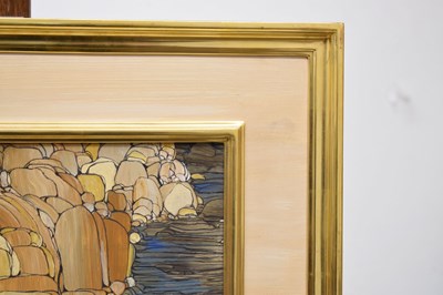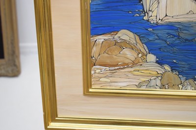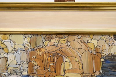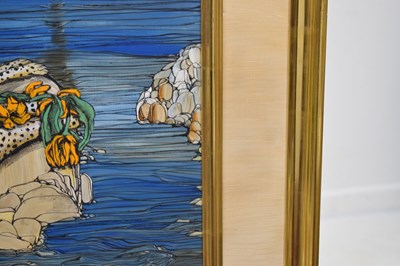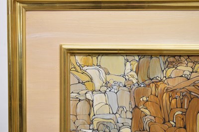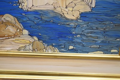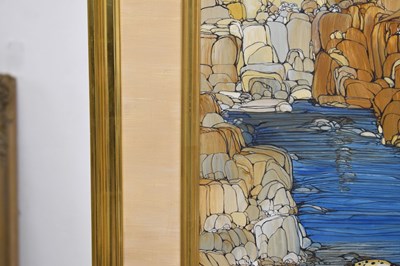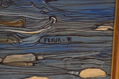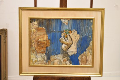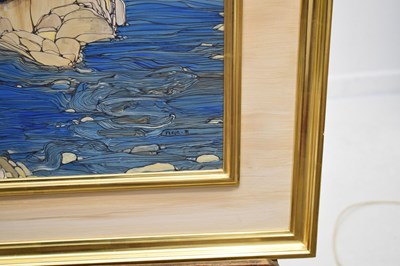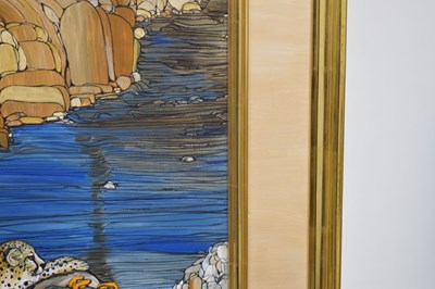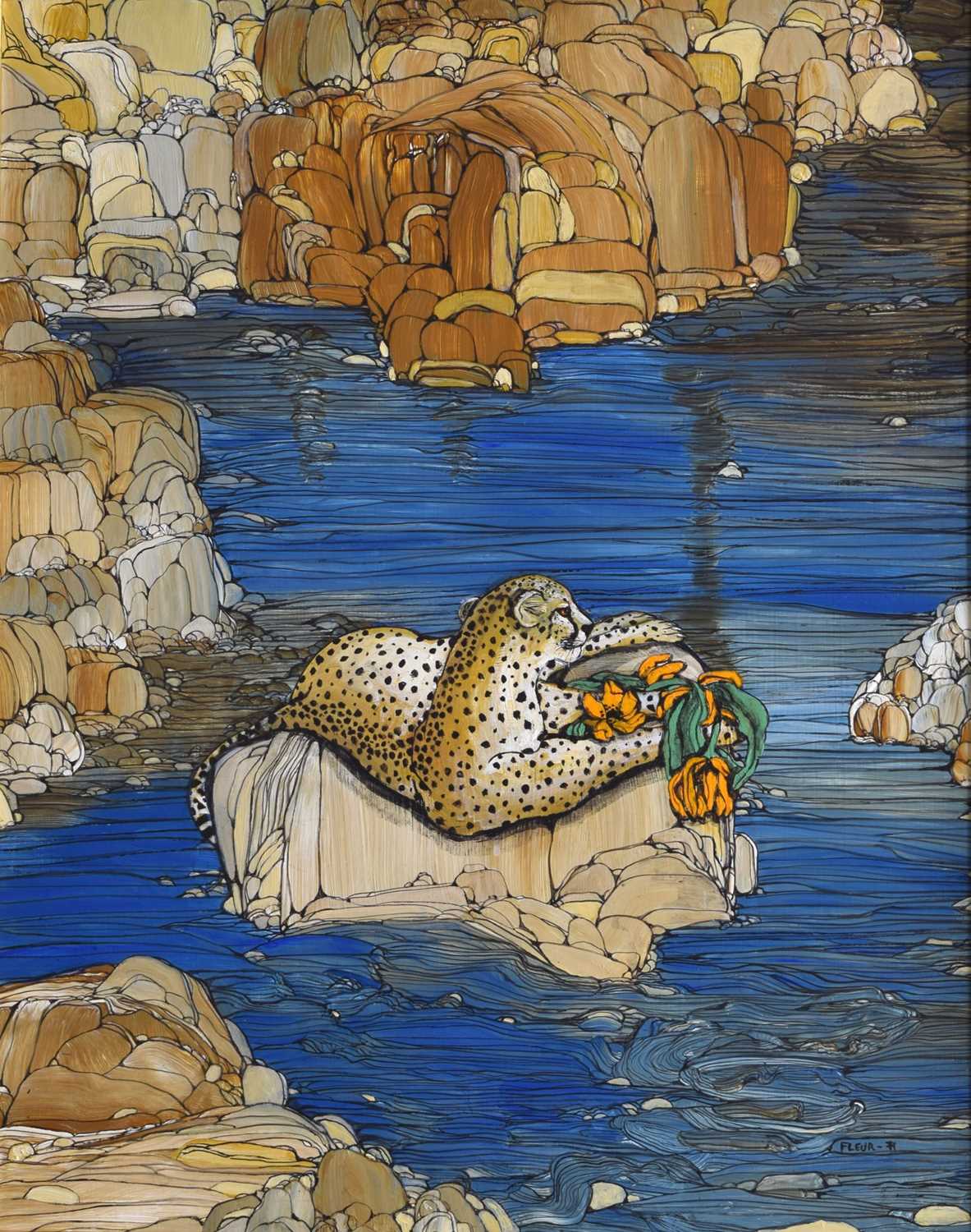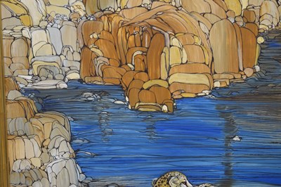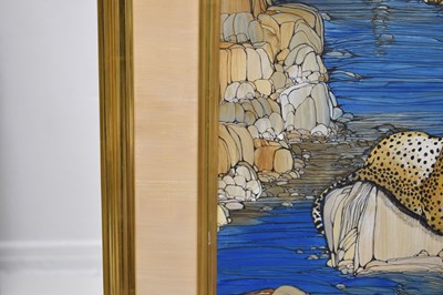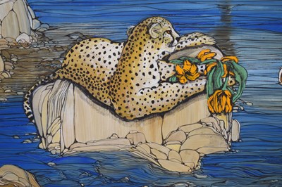 Fleur Fenton Cowles (American, 1908-2009) – Acrylic – Leopard resting on a rock surrounded by water, signed and dated '71 lower right, 45cm x 61cm, in gilt frame